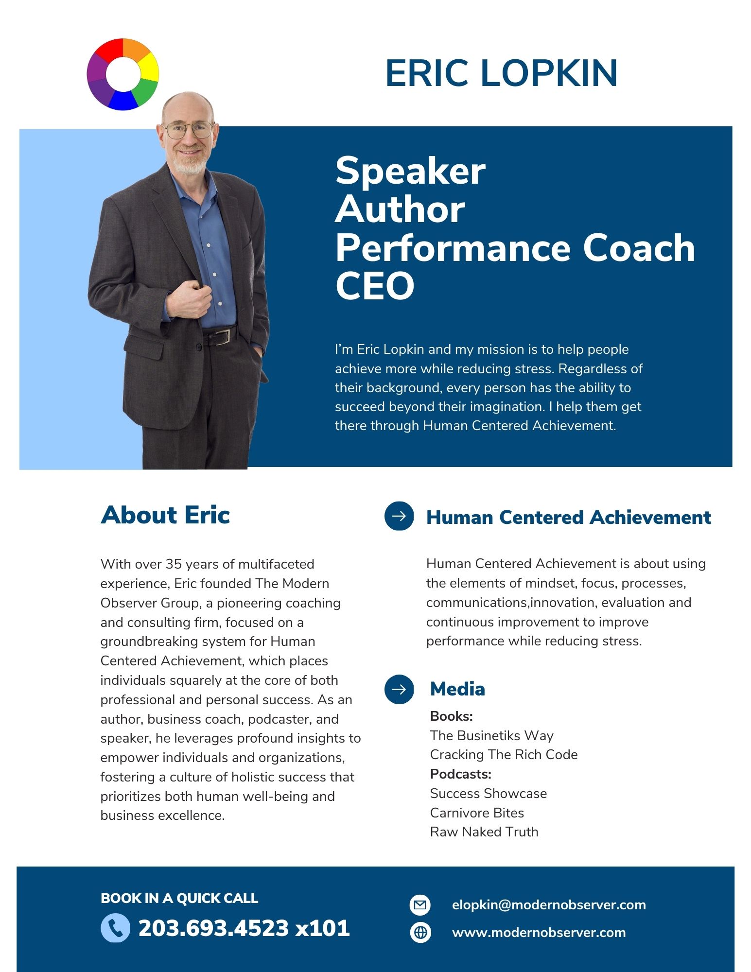 With over 35 years of multifaceted experience spanning journalism, advertising, public relations, finance, medical research, and operations, Eric Lopkin embodies a wealth of expertise. Fueled by this diverse background, in 2009 he founded The Modern Observer Group, a pioneering coaching and consulting firm, focused on a groundbreaking system for Human Centered Achievement, which places individuals squarely at the core of both professional and personal success. As an author, business coach, podcaster, and speaker, he leverages profound insights to empower individuals and organizations, fostering a culture of holistic success that prioritizes both human well-being and business excellence.